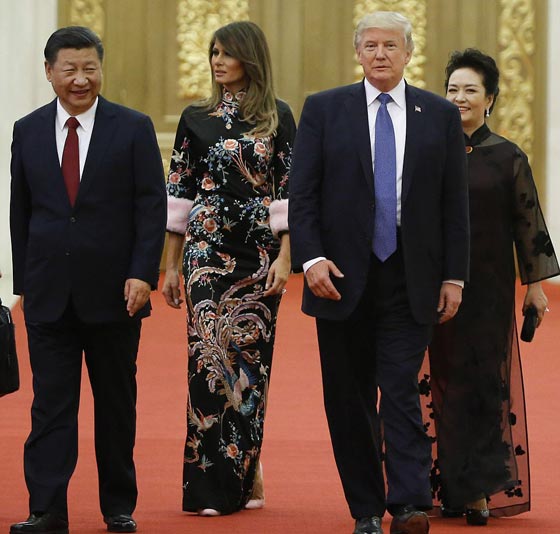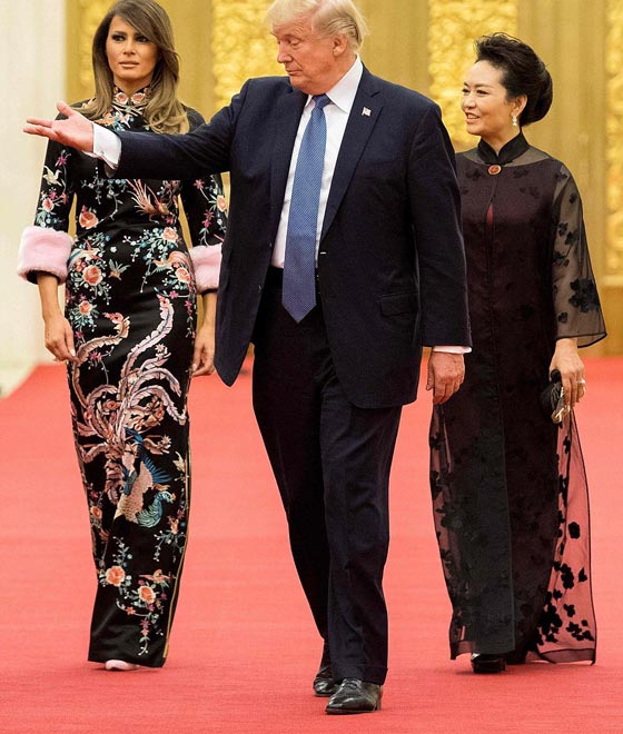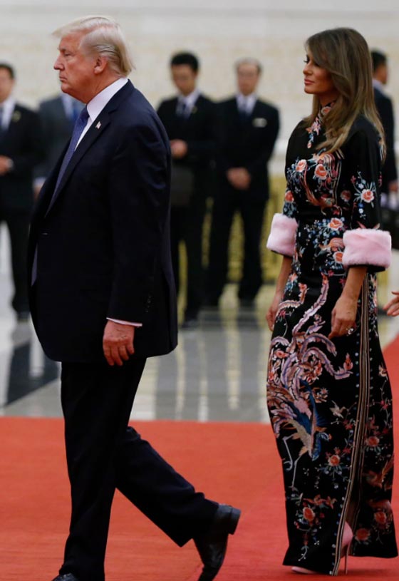 بدت سيدة أميركا الأولى، ميلانيا ترامب، في أروع صورها خلال عشاء رسمي حضرته في الصين ليلة الخميس برفقة زوجها الرئيس الأميركي، دونالد ترامب، الذي قام بزيارة رسمية للبلاد ضمن جولته الآسيوية. وارتدت ميلانيا ثوبا أسود رائعا وطويلا من تصميم غوتشي، بأكمام من الفراء، ومزخرف برسوم صينية كلاسيكية، جاءت ملائمة تماما لأجواء العشاء الذي أقامه الرئيس الصيني شي جين بينغ وزوجته تكريما لترامب وزوجته.