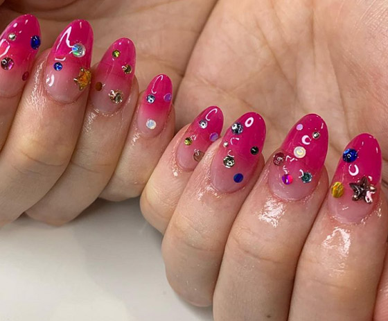 ويمكن طلاء الأظافر بلون فضى أو ذهبى أو حتى شفاف مع لصق بعض المجوهرات الصغيرة وردية اللون أو عبارة عن أحجار كريمة صغيرة ملونة والتي تتوافق مع ألوان الفساتين المختلفة.
