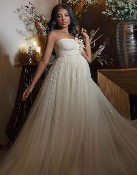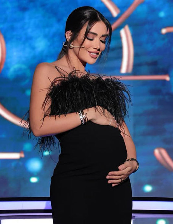 ارتأت النجمة السعودية داليا مبارك أن تظهر خلال حملها بفستان بيج منفذ من التول بقصة خالية من الأكمام ويزدان أعلى الصدر بزهرة كبيرة من الريش، وتنورة أميرية الطابع مزدانة بالباييت البراق الذهبي.