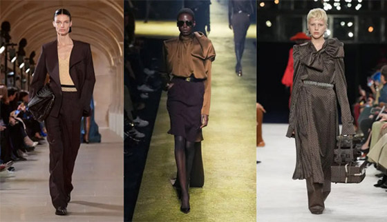 تُضفي تدرجات البني أناقة دافئة على الإطلالات اليوميّة، وهو من أبرز ألوان موضة موسم الخريف والشتاء، يترك هذا اللون لمسة من الأناقة غير المرتبطة بزمن، يُنصح باختياره كلون لسترة بلايزر، أو بدلة نسائيّة، أو حتى ثوب منسدل كما يمكن اعتماده كحذاء عالي الساق، أو حقيبة كبيرة، أو حتى حزام جلدي، واعتمدوا الطبعات الحيوانيّة بتدرجات البني المتنوعة واحرصوا على تنسيقه مع تدرجات البيج الفاتحة والداكنة.