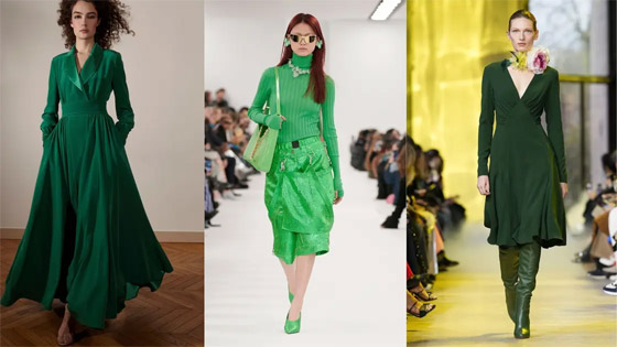 يتوفر هذا اللون بتدرجاته الفاتحة والداكنة في مجموعات هذا الموسم، وهو من الألوان الجريئة التي يصعب ارتداؤها ولكنه قادر على إضفاء لمسة من الأناقة المميّزة على كامل الإطلالة. الأخضر الساطع وأخضر الأشجار من التدرجات التي تكرّر ظهورها في المجموعات الشتويّة، يمكن اعتماده لكامل الإطلالة أو حتى لمعطف صوفي، ثوب حريري، وحذاء عالي الساق.