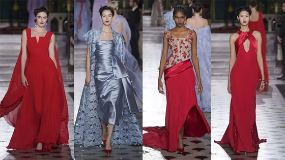 وقد تجلّى الطابع البصري لتلك الحقبة الفنيّة عبر الأشكال الهندسيّة والزخرفات الفنيّة التي زيّنت خامات الكريب الهش، والساتان المرن، والموسلين الحريري، والأورغنزا الذي تمّ قصّه باللايزر. أما بالنسبة للوحة اللونية التي اعتمدها المصمم فتنوّعت بين تدرجات الأبيض، والليلكي، والأزرق، والوردي بالإضافة إلى الذهبي، والفضي، والأحمر فجأت التصاميم كأنها تحتفل بما هو استثنائي في عالم الأناقة الساحرة.