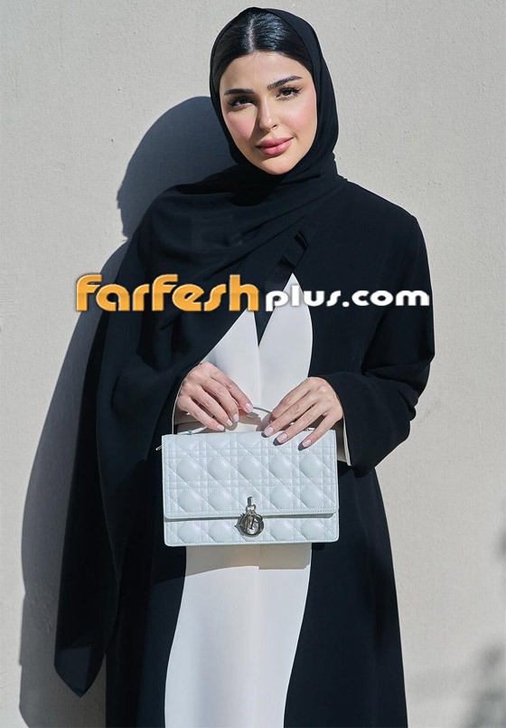 أيضاً سيكون الحجاب الأسود مثالياً مع عباية تجمع بين اللونين الأبيض والأسود مثل اطلالة حنين الصيفي، ولتكملي أناقتك بالاكسسوارات البيضاء أو السوداء.