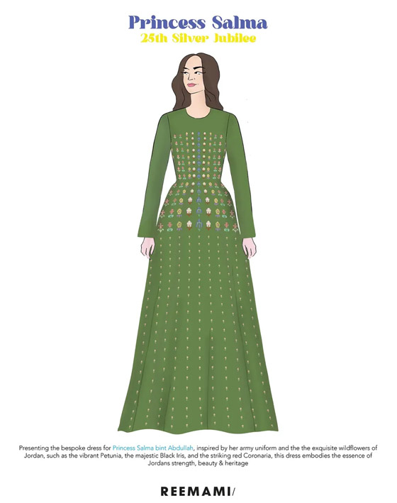 أما الأميرة سلمى فظهرت بثوب أخضر يحمل توقيع ريما البنّا المصممة الفلسطينية المستقرة في دبي وصاحبة علامة Reemami المعروفة بطابعها الشبابي. وقد جاء ثوب الأميرة سلمى مستوحى بلونه من لباسها العسكري ومطرّز بالأزهار الأردنية. وهو يُجسّد روح القوة وجمال التراث الأردني.
