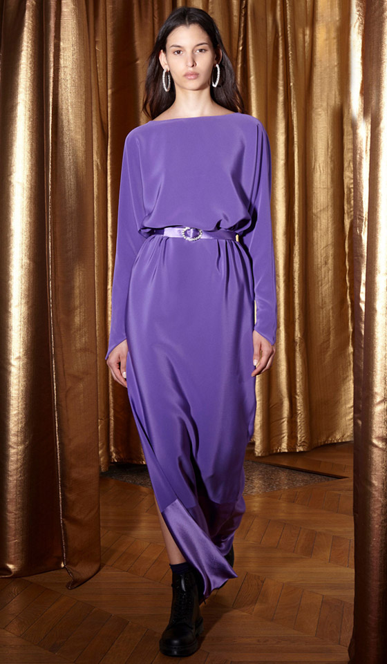 لن تستطيعي أن تقاومي جمال الفساتين الحرير المصممة بقصات محتشمة هذا الصيف، خاصة إذا كانت موحدة اللون وخالية من أي طبعات أو تطريز، كما في الفستان الأرجواني طويل الأكمام والمزين بشق قصير على الجانب والمزود بحزام من نفس لونه من مجموعة ماركة ألكسيس مابيل Alexis Mabille، لمزيد من الأناقة نسِّقيه مع حذاء مدبب أسود مزود بإبزيم يلف الكاحل، واحملي حقيبة صغيرة سوداء مبطنة ومزودة بسلسال فضي طويل، وزيني اذنيك بأقراط الـHoops الكبيرة المصممة من الفضة أو الذهب الأبيض.