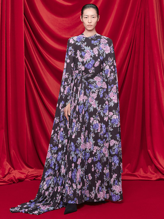 قدمت ماركة بالنسياغا Balenciaga واحد من أروع التصميمات التي رأيناها ضمن مجموعات صيف 2024، حيث تميز بقصته المحتشمة التي تغمر الجسم والتي أتت على شكل الكاب، وأشكال الورود الملونة المطبعة على خلفية سوداء وكسرات البليسيه التي تُزين التنورة الواسعة، تفادي هذا التصميم فقط إذا كنتِ قصيرة أو ممتلئة الجسم لأنه سيزيد من مشكلتك، وجربي تنسيقه مع صندل أسود بكعب عالٍ رفيع، واحملي حقيبة كلاتش سوداء عريضة وزيني أذنيك بأقراط Studs من الذهب الأبيض.