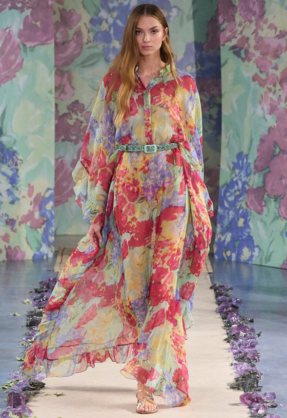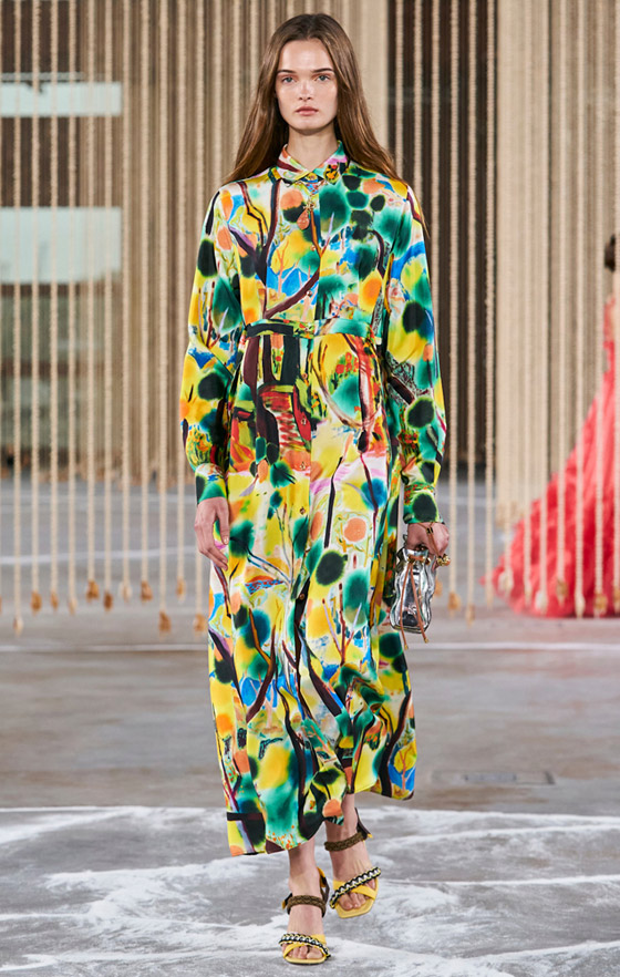 لا يمكن تصور خزانة الصيف من دون الفساتين المصممة من خامات ناعمة والمطبعة بأنماط الورود الزاهية، ولتحصلي على إطلالة مواكبة للموضة، اختاري فستانك المورد من الشيفون المصمم على طراز القميص مثل التصميم الذي ظهرت به إحدى عارضات ماركة لويزا بيكاريا Luisa Beccaria، زينيه بحزام يحدد الخصر على طريقتها، ويُفضل أن يكون بلون متوفر في الطبعة، وانتعلي صندلاً فضياً، واختاري حقيبتك باللون الزهري المحمر.