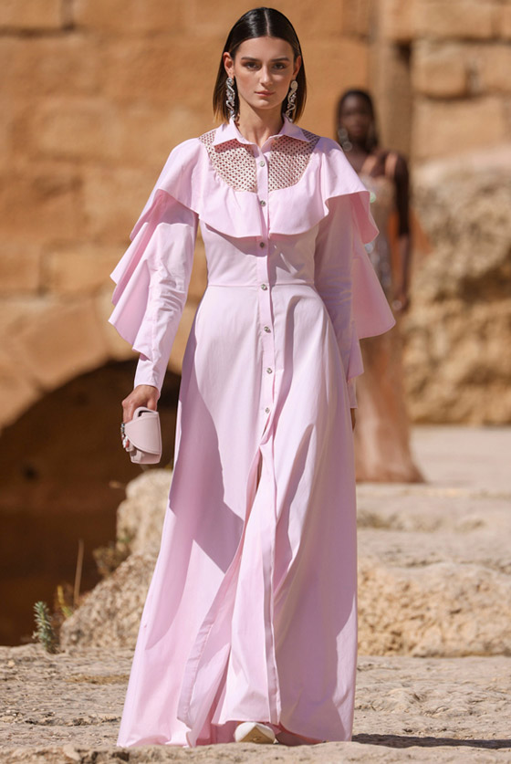 كان للفساتين المصممة بقصة القميص حصة كبيرة ضمن مجموعات الأزياء الجاهزة هذا الموسم، وقدمت بأشكال متنوعة كفيلة بإرضاء كافة الأذواق، ولكننا أحببنا الفستان الناعم المحتشم والطويل والمصمم بإحدى نغمات الزهري الفاتحة التي تميل للون الليلك من مجموعة المصمم جورج حبيقة Georges Hobeika، ويمكنك تنسيقه مع حذاء مدبب أبيض بكعب رفيع قصير، واحملي حقيبة صغيرة من نفس لونه، وزيني الطلة بأقراط طويلة مرصعة وساعة من الذهب الأبيض.
