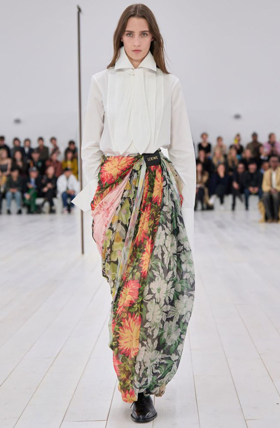 جربي اختيار تنورة طويلة من لويفي Loewe تلتف حول القوام وتقفل بزر، وهي تتميز بقماش من الموسلين المطبع بالورود الملونة على قاعدة باللون الأخضر، ويمكن تنسيقها مع قميص كلاسيكي أبيض. وتتسم هذه التنورة التي اخترناها لك من لويفي Loewe بتداخل عدة أنواع من الأقمشة المطبعة بالزهور، وقد انتعلت العارضة الحذاء الجلدي اللامع المسطح والمزدان برياط لمظهر شتوي راقٍ. وزادتها ربطة العنق الحريرية رقياً. أما إذا كنت تريدين استعمال التنورة لغدائك على شاطئ البحر أو تحت الشمس، فيمكن الاستعانة بكورسيه موحد مع نفس القميص المفتوح الأزرار. ويمكن استبدال الحذاء بخف مسطح.