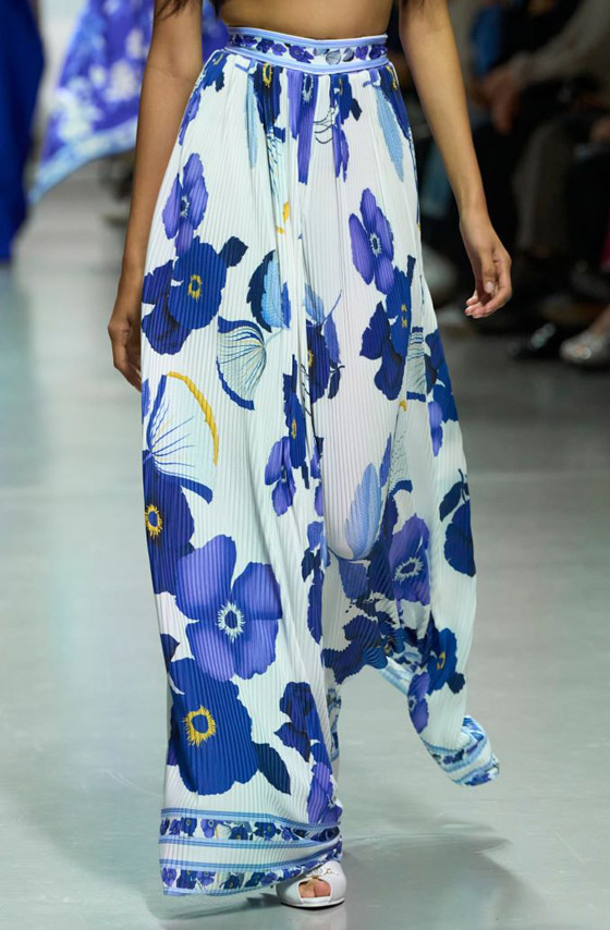 وبدورها اختارت دار ليونارد باريس Leonard Paris التنورة الحريرية البيضاء المطبعة بورود زرقاء بحرية كبيرة، ويمكن تنسيق كروب باللون الأزرق أو الأبيض بقصة ضيقة وقصيرة، ويمكن انتعال حذاء أبيض عالٍ مفتوح من الإصبع.