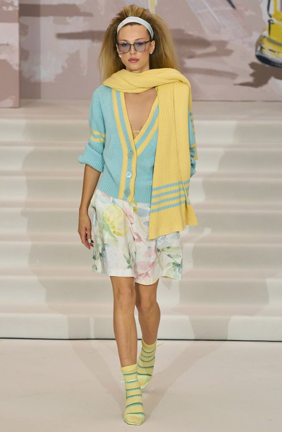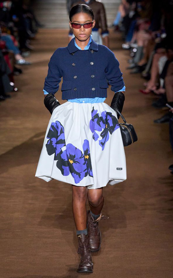 كما أحببنا هذه الإطلالة الشبابية العصرية من ميوميو Miu Miu والتي تمثلت بتنورة بيضاء قصيرة متعددة الطيات، وتتسم بطبعات الورود الضخمة المتفرقة، ويمكن تنسيقها مع كارديغان أزرق بأزرار مزدوجة، وتتسم بتصميم قصير ومربع، ويمكن ارتداؤها فوق قميص من الدنيم الأزرق، ولا تنسي القفازات الجلدية السوداء الطويلة وحذاء جلدي أسود متوسط الساق من نوع Combat Boots.