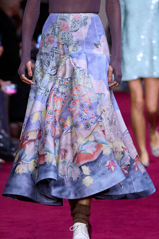 كما نفذت دار زيمرمان Zimermann التنورة المصنوعة من الشانتون الأزرق المطبع بزهور كبيرة وملونة تجسد لوحة فنية، ويمكن تنسيقها مع بلوزة بنفسجية قاتمة شفافة بأكمام طويلة، ويمكنك انتعال حذاء رياضي أبيض جلدي مع جوارب صوفية بنفسجية طويلة للحصول على إطلالة ستريت ستايل.