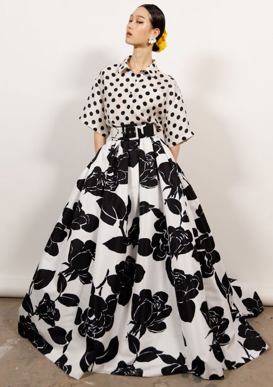 وللحصول على إطلالة راقية لمناسبات الأعراس ومناسبات السجادة الحمراء، اختاري القميص الحريري المنقط باللونين الأبيض والأسود والذي يتسم بياقة مع أكمام قصيرة. واحرصي على اعتماد تنورة منفوخة طويلة وواسعة بيضاء، مطبّعة بالورود الكبيرة السوداء التي تلامس الأرض. ويمكنك اختيار تسريحة شينيون منخفضة مع زهرة كبيرة صفراء تزين شعرك ولا تنسي اعتماد آيلاينر مجنّح للمزيد من الإطلالة الدرامية على المظهر بشكل عام.