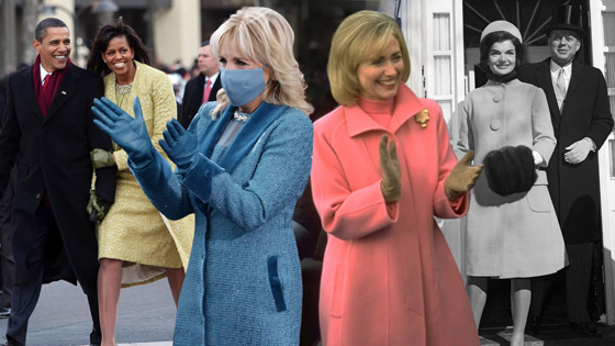 مع ذلك، لطالما كانت مراسم تنصيب رئيس الولايات المتحدة فرصة للسيدة الأولى لترك انطباع أول فوري. وغالبًا ما فعلت ذلك من خلال اختيارات الأزياء خلال الحدث الذي يمتد من النهار إلى المساء. في عام 2021، روّجت جيل بايدن لروح الوِحدة من خلال الرمزية الدقيقة، مرتدية فستانًا مصمما خصيصًا باللون العاجي ومعطفًا من الكشمير من تصميم غابرييلا هيرست، مطرّزًا بالزهور الفيدرالية من كل ولاية وإقليم أمريكي.