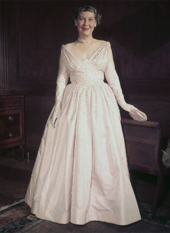 كانت مامي أيزنهاور تدرك قوة الصحافة والدعاية. وفي عام 1953، رغم دعوات الصحف إلى الكشف عن تفاصيل فستان حفل التنصيب آنذاك ، إلا أنها تعمدت تأخير نشر بيان صحفي حول ذلك، وفقًا لمؤسسة سميثسونيان. وكان الفستان الذي صممته نيتي روزنشتاين مزينًا بأكثر من 2000 من حجر "الراين" المخيط يدويًا، وكان مصحوبًا بقفازات أوبرا متطابقة، وحقيبة مرصعة بأحجار "الراين"، وقلادة ثلاثية الخيوط من اللؤلؤ.