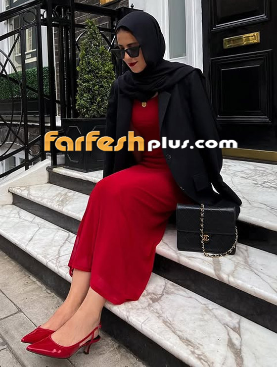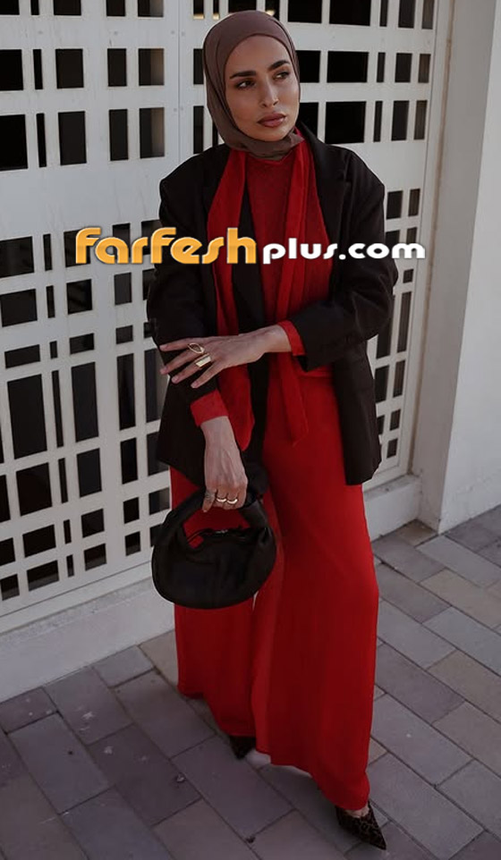 اتبعي طريقة مدونة الموضة سهى طه في تنسيق الكنزة الـV Neck القصيرة الحمراء باحتشام، وارتدي تحتها قميصاً أبيضَ طويلاً، وأكملي اللوك الكاجوال ببنطلون جينز Wide Leg أسود أو رمادي داكن، ولتحصلي على لوك متناغم وأنيق اختاري الطرحة باللون الأسود، وانتعلي حذاءً مدبباً أحمرَ، لائميه مع حقيبة صغيرة من اللون عينه.