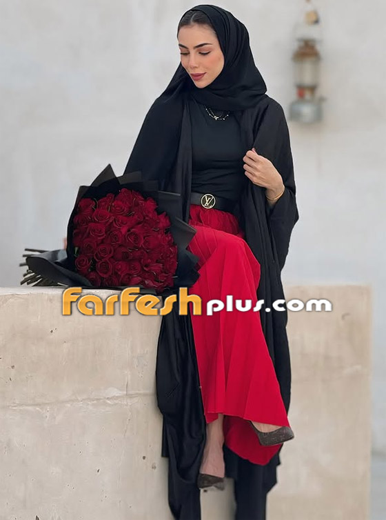 4- التنورة البليسيه الحمراء مع العباية السوداء: