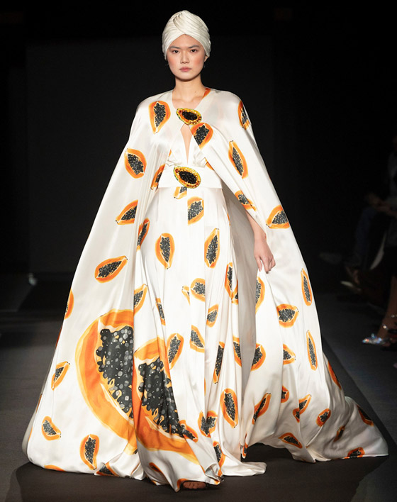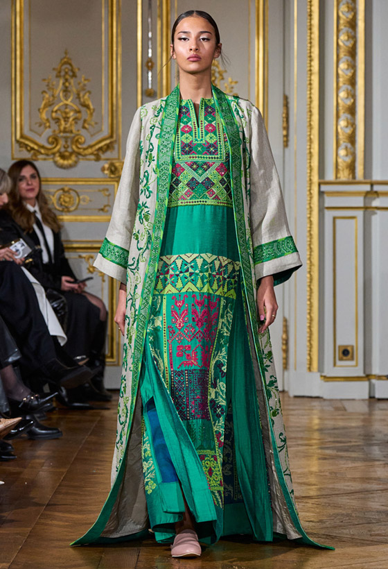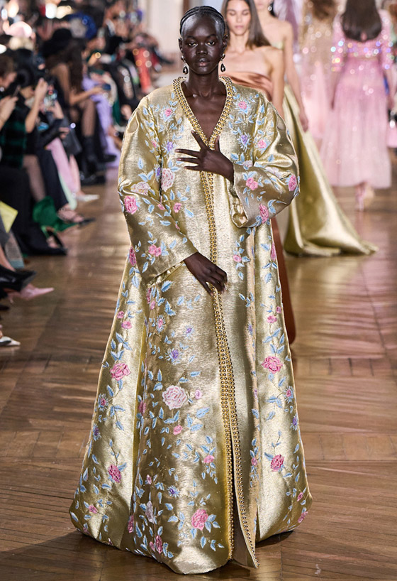 أهدى المصمم جورج حبيقة Georges Hobeika مجموعته لربيع وصيف 2025 لوالدته الراحلة، فكان من الطبيعي أن يطغى عليها الطابع الشرقي، فمشت إحدى العارضات مرتديه قفطاناً واسعاً يغمر جسمها مميزًا بلونه الذهبي الخاطف للأنظار، ليؤكد على تربع الألوان الميتاليك على عرش الموضة، وقد جاء بفتحة صدر V Neck وازدان بتطريزات على شكل ورود ملونة أضفت عليه لمسة ربيعية مميزة، سيكون هذا التصميم الفخم مناسباً لدعوات إفطار رمضان 2025، جربي تنسيقه مع حذاء مدبب باللون الذهبي، واحملي كلاتشًا أسود صغيرًا مزودًا بقفل وسلسال ذهبي، وارتدي أقراطًا متدلية من الذهب الأصفر المرصع بالألماس، وغطي رأسك بطرحة وردية فاتحة.