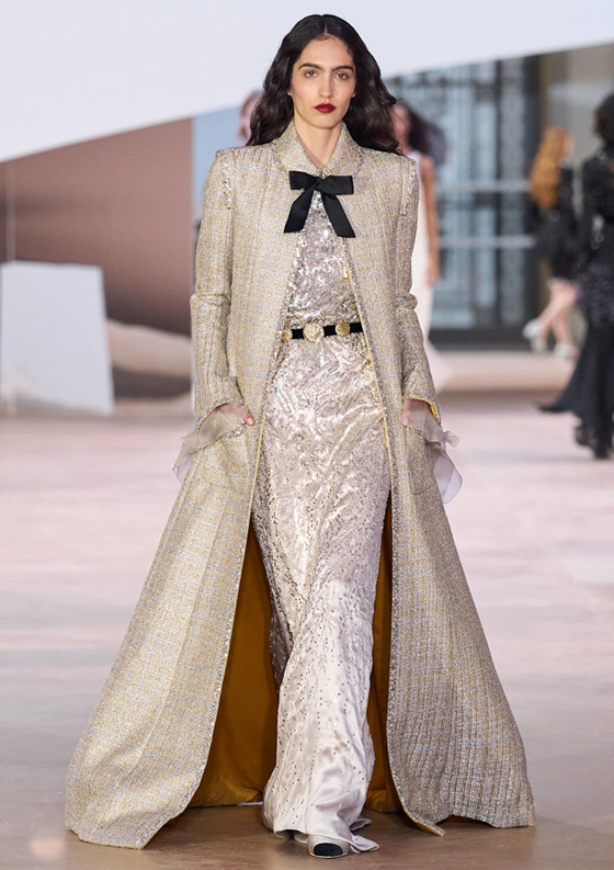 لا يزال الطقس بارداً خاصة في الساعات المتأخرة من الليل، لذا ستكون العبايات الصوف مثالية لإطلالات سحور رمضان، قدمت دار شانيل Chanel تصميماً فائق الأناقة من التويد الفاخر الذي تشتهر به، فظهرت إحدى العارضات بمعطف طويل مستوحى من قصة العبايات الخليجية تميز بلونه الرمادي الفاتح وخيوطه المعدنية، وقد صمم بياقة عالية مزينة بفيونكة سوداء صغيرة والتي تعد من أبرز توجهات 2025، لا تترددي في تنسيق تلك القطعة الفريدة مع الفساتين السوداء السادة، وأكملي أناقتك بحذاء أسود سادة بكعب عالِ رفيع، واحملي حقيبة فضية صغيرة، وارتدي أقراطًا ناعمة من الذهب الأبيض.