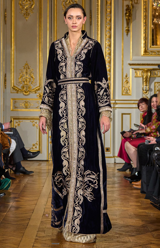 خلال العروض الشرقية التي استبقت أسبوع باريس وأقيمت على هامشه، قدم المصممون العرب والعالميون تشكيلة واسعة من القفاطين التي ارتكزت على التصميم التقليدي المحبب للنساء العربيات، من جهتنا أحببنا القفطان الأسود الـ V Neck المحبوك بتطريز ذهبي ومزود بحزام يحدد الخصر من مجموعة ماركة أمينة Amina، نسقيه مع حذاء وحقيبة باللون الذهبي لترفعي من قيمته، وارتدي أقراطًا متوسطة الطول من الذهب الأصفر المرصع بالألماس.