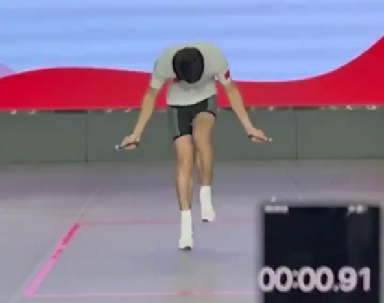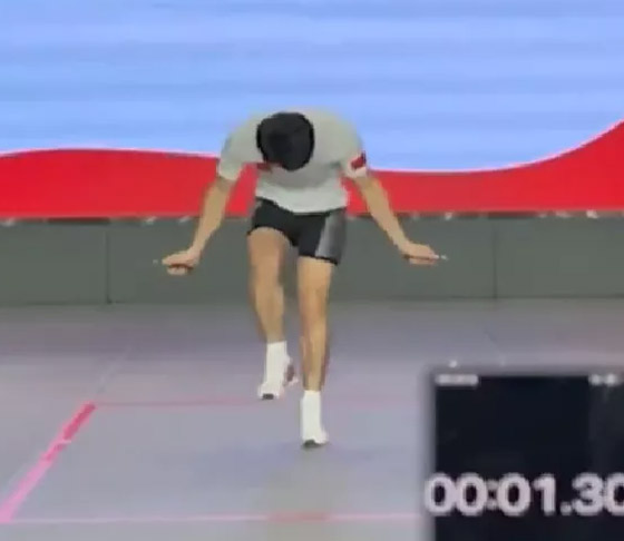 تداول رواد مواقع التواصل الاجتماعي مقطع فيديو لطالب صيني، حقق رقمًا قياسيًا عالميًا في رياضة "القفز بالحبل". ويُظهر الفيديو، الذي تم تداوله، طالبا صينيا يبلغ من العمر 23 عاما، وهو يسجل رقما قياسيا عالميا في لعبة "القفز بالحبل" في دقيقة واحدة. وتمكّن الطالب من القفز 388 مرة، أي أنه قام بأكثر من 6 قفزات في الثانية. ودخل الطالب الصيني بهذا الرقم في سجل موسوعة غينيس للأرقام القياسية.