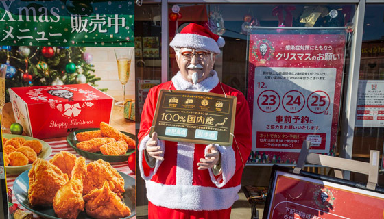 ومن جهة أخرى، يعتبر العديد من اليابانيين أن عشاء عيد الميلاد التقليدي هو كنتاكي فرايد تشيكن KFC. فيتهافتون لتناول الدجاج المقلي بدلًا من حبش العيد كما تحضر وجبات مخصصة للمناسبة وترتدي تماثيل الكولونيل ساندرز Colonel Sanders عند مدخل المطاعم اليابانية زي سانتا.