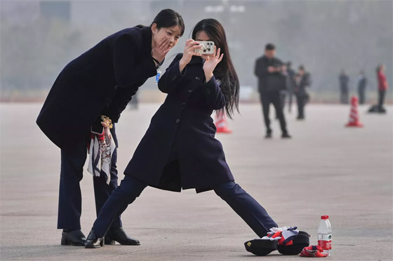 - زائرة تستخدم هاتفا ذكيا لالتقاط صورة لزميلتها في ميدان تيانانمن خلال اختتام المؤتمر الاستشاري السياسي للشعب الصيني في بكين