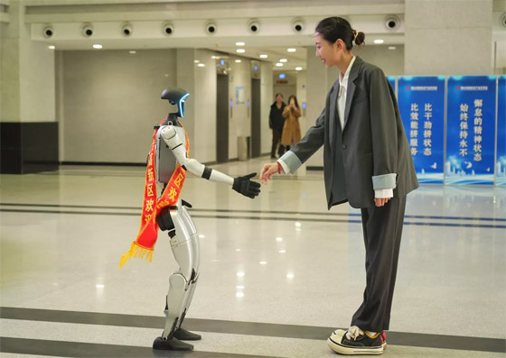 - روبوت شبيه بالإنسان الآلي "يونيتري جي 1" يصافح الضيوف في مبنى تشوانغي في منطقة يانتاي للتكنولوجيا الفائقة في مقاطعة شاندونغ شرق الصين.
