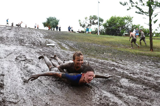 - مراهقون ينزلقون على تلة طينية في بورلي هيدز في جولد كوست، أستراليا.
