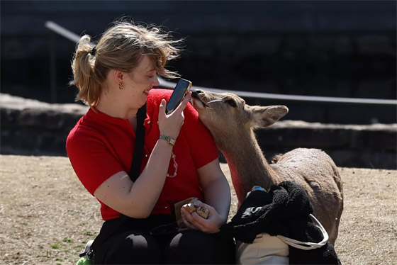 - سائح يلتقط صورة لغزال بري يتجول بحرية في نارا، اليابان.