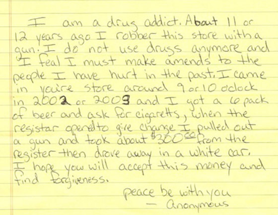 في أوائل العقد الأول من القرن الحادي العشرين، تعرَّض سوق InterAsian في ناشفيل بأمريكا للسرقة. استعان رجل بالسلاح وتمكن من سرقة نحو 300 دولار، ولم تتمكن الشرطة من القبض على هذا الرجل قط، لكن الأمر لم ينته عند هذا الحد. فبعد ما يزيد على عشرة أعوام، ظهر رجل يصر على أن يأخذ نجل المالك ظرفاً يحمل كلمة "OWNER"، وتبين أن بداخل الظرف خطاب اعتذار و300 دولار نقداً.