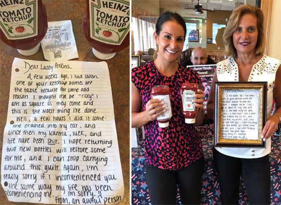ربما لم تكن ماريا ديليو، صاحبة مطعم بيرلينز ديليو، في لاسي تاونشيب، بنيوجيرسي، قد لاحظت من الأساس اختفاء زجاجة كاتشب واحدة من مطعمها، لكنها فوجئت في أثناء جلوسها أمام باب المطعم برسالة تصل إليها، يعترف فيها كاتبها بأنه سرق زجاجة من الكاتشب. لكن بعد هذا الموقف الذي يبدو بسيطاً للغاية، شعر الرجل بأن حياته تسير إلى الأسوأ، وتعرض لكثير من المواقف السيئة والصعبة، فقرر أن يعيد إلى صاحبة المطعم زجاجتين من الكاتشب بدلاً من الزجاجة التي سرقها. وقال في رسالته: "آمل أن تعيد قنّينتان جديدتان من الكاتشب بعض الحظ لي، وتمكناني من التوقف عن الشعور بهذا الذنب وتحمُّل تأنيب الضمير، مرة أخرى، أنا آسف حقاً".