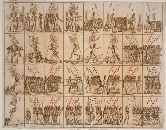 كانت الأوراق الأصلية المرسومة باليد سلعاً فاخرة للأثرياء، ثم انتشرت البطاقات تدريجياً على طول طرق التجارة الأوروبية الداخلية خلال القرن الخامس عشر، باعتبارها هواية مفضلة لدى الطبقة الأرستقراطية. أدى اختراع الطابعة الخشبية لغوتنبرغ في أوائل القرن الخامس عشر، إلى انخفاض كبير في تكلفة الإنتاج، التي تم تخفيضها بشكل أكبر في فرنسا بثمانينيات القرن الخامس عشر، من خلال الطلاء عبر الإستنسل (التلوين عبر الأسطح المفرغة). بهذه الطريقة في الطباعة، صممت فرنسا أشكالاً مبسطة مميّزة للعلامات على ورق اللعب، والمعروفة حالياً برمز القلب ♥، والألماس ♦، وجاروف البستوني ♠، وورقة النبات الثلاثية ♣.