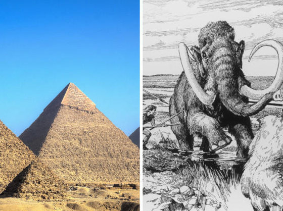 المعلومات تقول إن آخر ماموث انقــرض على كوكب الأرض منذ حوالي 1700 عام قبل الميلاد على جزيرة رنجل روسيا.. وفي مصر بنيت أهرامات الجيزة منذ حوالي 4000 عام قبل الميلاد أو أكثر. أيضـاً، الوقت الذي تقلّدت فيه كليـوباترا حُكم مصـر أقرب بكثيـر إلى وقتنـا الحالي من بنـاء الأهرامات.. حيث يشير البعض أنها توفيت منذ 30 عام قبل الميلاد.. أي منذ ألفي عام تقريباً فقــط، مقــارنة بـ4000 آلاف عام سبقتها فى بنــاء الأهرام!