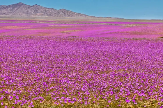بينما يتخيل الجميع صورة الأرض الصفراء الجرداء، عند ذكر كلمة صحراء، نفاجأ بهذا المشهد العجيب في صحراء أتاكاما الواقعة في تشيلي، والتي يمكن أن يتبدل مظهرها بين ليلة وضحاها مع سقوط الأمطار الغزيرة، مع العلم بأن تلك الظاهرة التي تحدث في نوفمبر، لا تتكرر إلا كل 4 أو 5 أعوام.