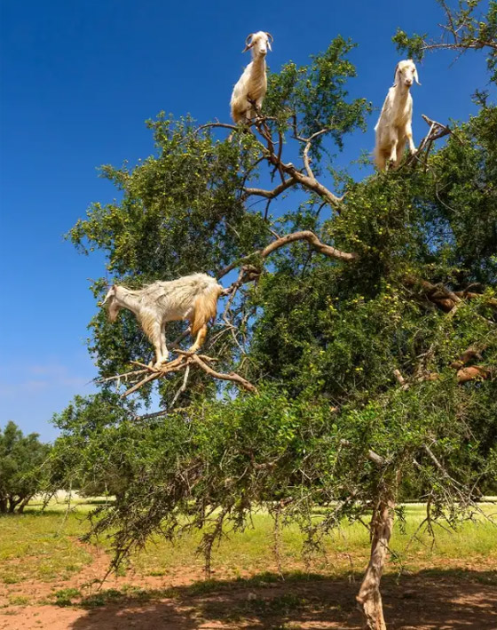 تبدو وكأنها صورة مفبركة إلا أنها تحدث في المغرب، خلال شهر يونيو من كل عام، حين تصبح الأركان طازجة على أشجارها، لذا لا تجد الماعز أي أزمة في تسلق تلك الأشجار للحصول على طعامها عندما تشعر بالجوع.