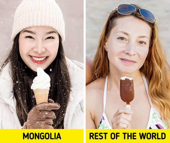 بينما نستمتع بالآيس كريم في أيام الصيف الحارة، ففي منغوليا، يفضلون تناوله خلال أبرد أيام الشتاء، وهناك باعة متجولون يبيعون الآيس كريم من الصناديق الورقية دون الحاجة إلى المجمد لأن درجات الحرارة يمكن أن تصل إلى -22 درجة فهرنهايت.