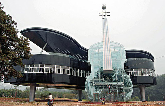 8. مبنى البيانو والكمان - الصين: هو مبنى بمثابة صالة عرض في مدينة هواينان، الصين. والكمان شفاف يضم السلالم الكهربائية والدرج لبناء البيانو الرئيسي الذي يعرض الخطط المختلفة وآفاق التنمية لمنطقة المطورة حديثاً. بسبب شكله الفريد أنها أصبحت مكاناً سياحياً شهيراً. وقد أطلق عليه السكان المحليون "المبنى الأكثر رومانسية في الصين".