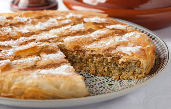 4. فطيرة الباستيا المغربية: الباستيا، عبارة عن فطيرة مغربية تُعرف أيضًا باسم بيستيا أو بستيا، وتُستخدم فيها تتبيلة حارة، وتجمع بين لحم الدواجن، واللوز، والبيض. ورغم أن الحمام وفرخ الحمام كان لحم الدواجن التقليدي المستخدم، إلا أن النسخة المحدثة منها تستخدم الدجاج.