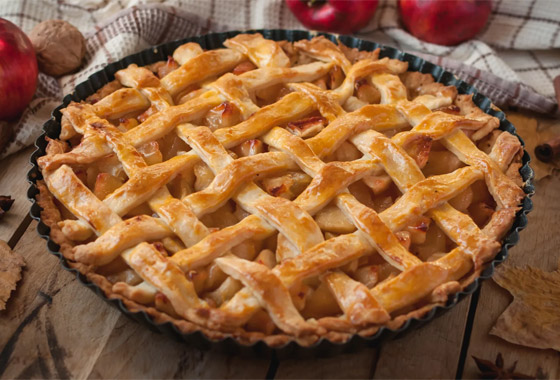 5. فطيرة التفاح: فطيرة التفاح هي فطيرة أمريكية أساسية، وورد في كتاب "على الطريق" (On the Road) لجاك كيرواك ما يلي: "تناولت فطيرة تفاح أخرى ومثلجات؛ هذا عمليًا كل ما تناولته في أنحاء البلاد". لكن جذور فطيرة التفاح نشأت في أوروبا، حيث يتم استيراد العديد من أصناف التفاح إلى قارة أمريكا الشمالية.