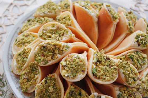 3ـ تصبّ العجينة على الصاج أو في مقلاة للبيض على النار، بواسطة مصبّ خاصّ أو الركوة، بشكل دائريّ. وعندما تجفّ قطع العجين، تنقل إلى وعاء مسطح، وتحشى كلّ قطعة بالقشطة، ويوزع عليها الفستق، وتقدّم مع القطر.