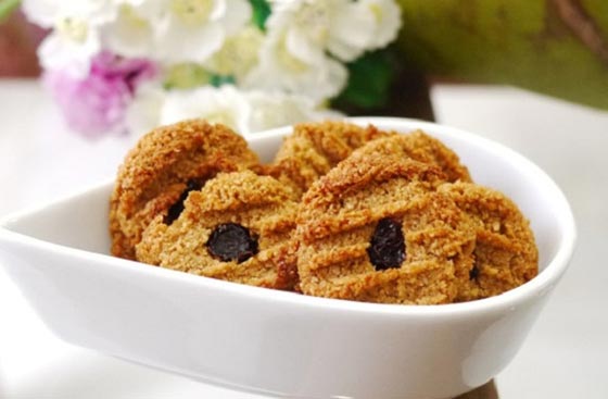 4 - شكلي الكوكيز دوائر صغيرة ورصيها متباعدة في صاج فرن مدهون سمن، وزيني كل واحدة بحبة زبيب واضغطي في المنتصف كي لاتحترق حبة الزبيب.