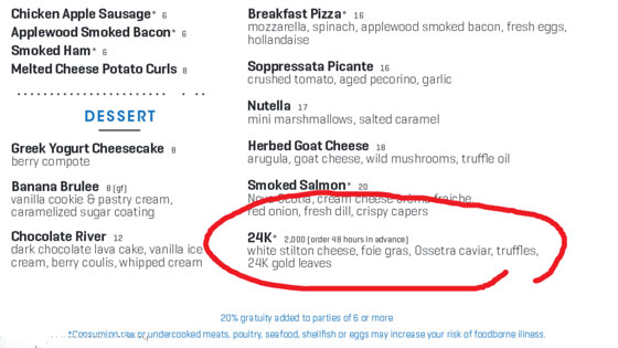 يقدم أحد مطاعم مانهاتن بنيويورك بيتزا خاصة أطلقوا عليها اسم "24 قيراط"، بحسب ما يظهر في قائمة الطعام الخاصة بالمطعم. ويتألف الطبق "24 قيراط" الذي يقدمه مطعم "إندستري كيتشن"، الواقع على شاطئ "إيست ريفر" ومنطقة ساوث ستريت سيبورت في مدينة نيويورك، من أوراق الذهب 24 قيراط، بالطبع القابلة للأكل والهضم، وجبنة ستيلتون البيضاء وكبد الإوز والكمأ وكافيار أوسيرتا الغالي الثمن.
