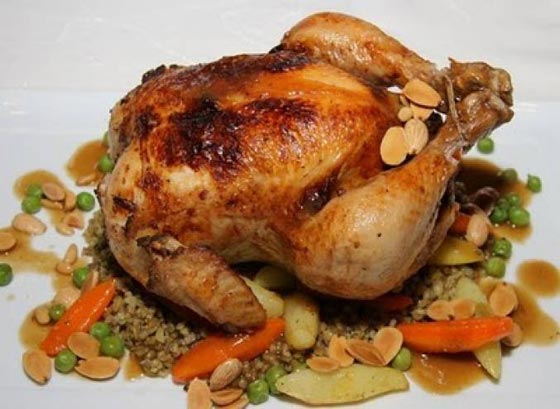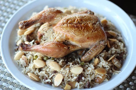 1. تغسل الفراريج وتتبل بالبهارات القرفة والبهار السادة والفلفل الأسود والملح ثم تسلق.