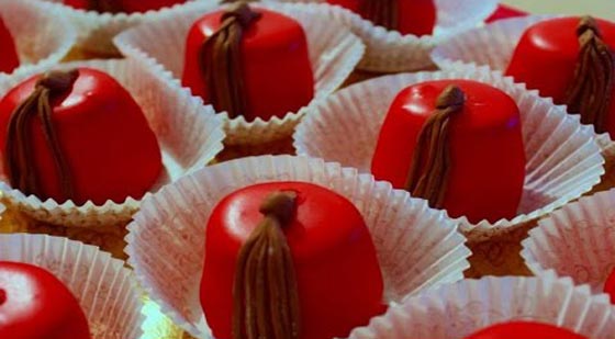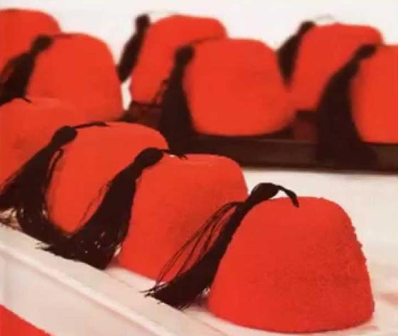 - هناك طريقة ثانية هي خبز الحلوى أولا وبعد ان تبرد نملأ محقان التزيين بالشوكولاتة المذابة لكن ليست سائلة ونرسم بحذر شكل الدنداش على كل طربوش.