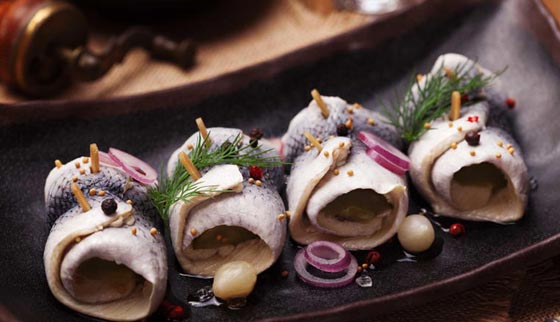 يؤكل سمك الرنجة المملح ليلة رأس السنة مع البصل أو صلصة الكريمة.