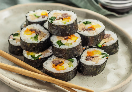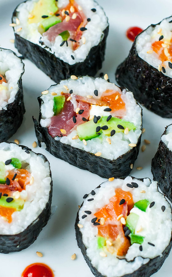 بعض الأرز ومعه بعض السمك النيء أو الروبيان، تلف بقطعة من الأعشاب البحرية، وتغمس بخليط من الصويا والزنجبيل والواسابي الشهير بلسعته الشديدة. ولا ننسى بالطبع العودين الخشبيين لتعيش عالما جديدا من البهجة اليابانية ولكن مهلا... يقال إن أصل السوشي لم يأت من اليابان، بل من جنوب شرق آسيا إلى جنوب الصين ومن هناك إلى اليابان. كانت الأسماك تُلَف بالأرز المتخمر، ومن ثم يتم التخلص من هذا الأرز وتناول الأسماك فقط.