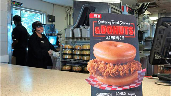 من الواضح أن الأميركيين باتوا مؤخرا مهووسين بشطائر أو ساندويش الدجاج، إضافة إلى هوسهم التقليدي بالوجبات السريعة وأنواع الفطائر الحلوى التي تحتوي على الكثير من السكر، مثل الدوناتس. ويبدو أن شركة الوجبات السريعة المعروفة "كينتاكي فرايد تشيكن" قررت دخول هذا المعترك بطريقة "تجديدية"، حيث ستجمع هذ الهوس في ساندويشة غريبة.