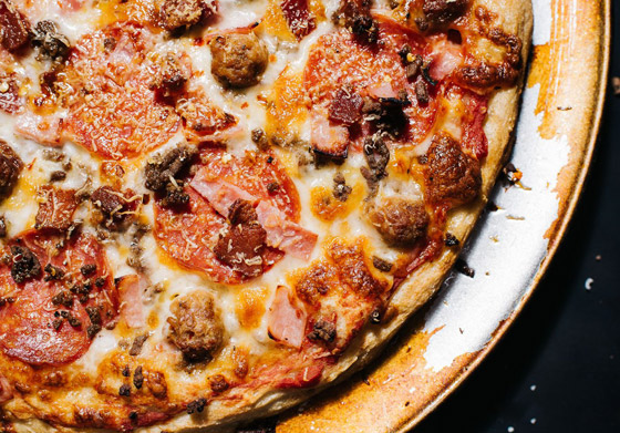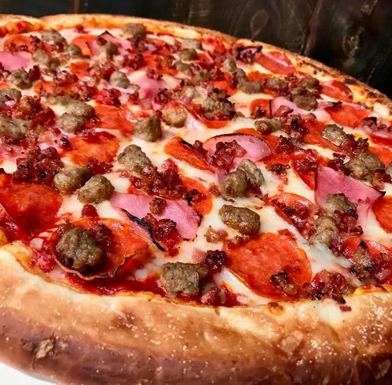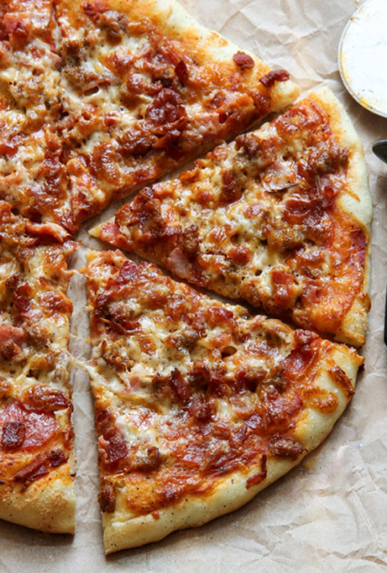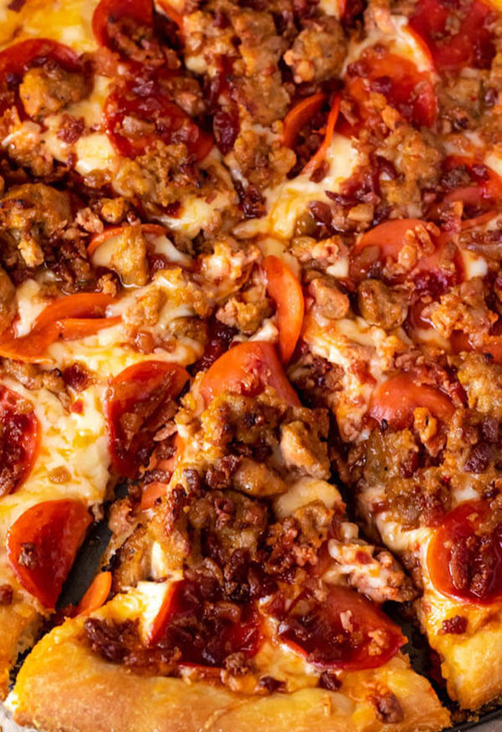 6. تقطع البيتزا وتقدم ساخنة.