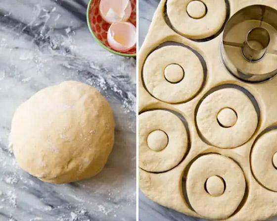بعد ذلك يتم تقطيع العجين ويشكل على شكل الدونات المعروف بواسطة القطاعة الخاصة بها، بعد ذلك يتم وضع قطع الدونات على صينية مدهون بقليل من الزبدة مع ضرورة ترك مسافة كافية بين كل واحدة وأخرى حتى لا يلتصقا مع بعضهم البعض وتترك في الصينية لمدة 20 دقيقة حتى يرتاح العجين وتدخل الفرن على درجة حرارة 180 لمدة ربع ساعة كاملة، تخرج قطع الدونات من الفرن وتترك حتى تبرد تماما بعد ذلك يتم تزيينها حسب الرغبة.